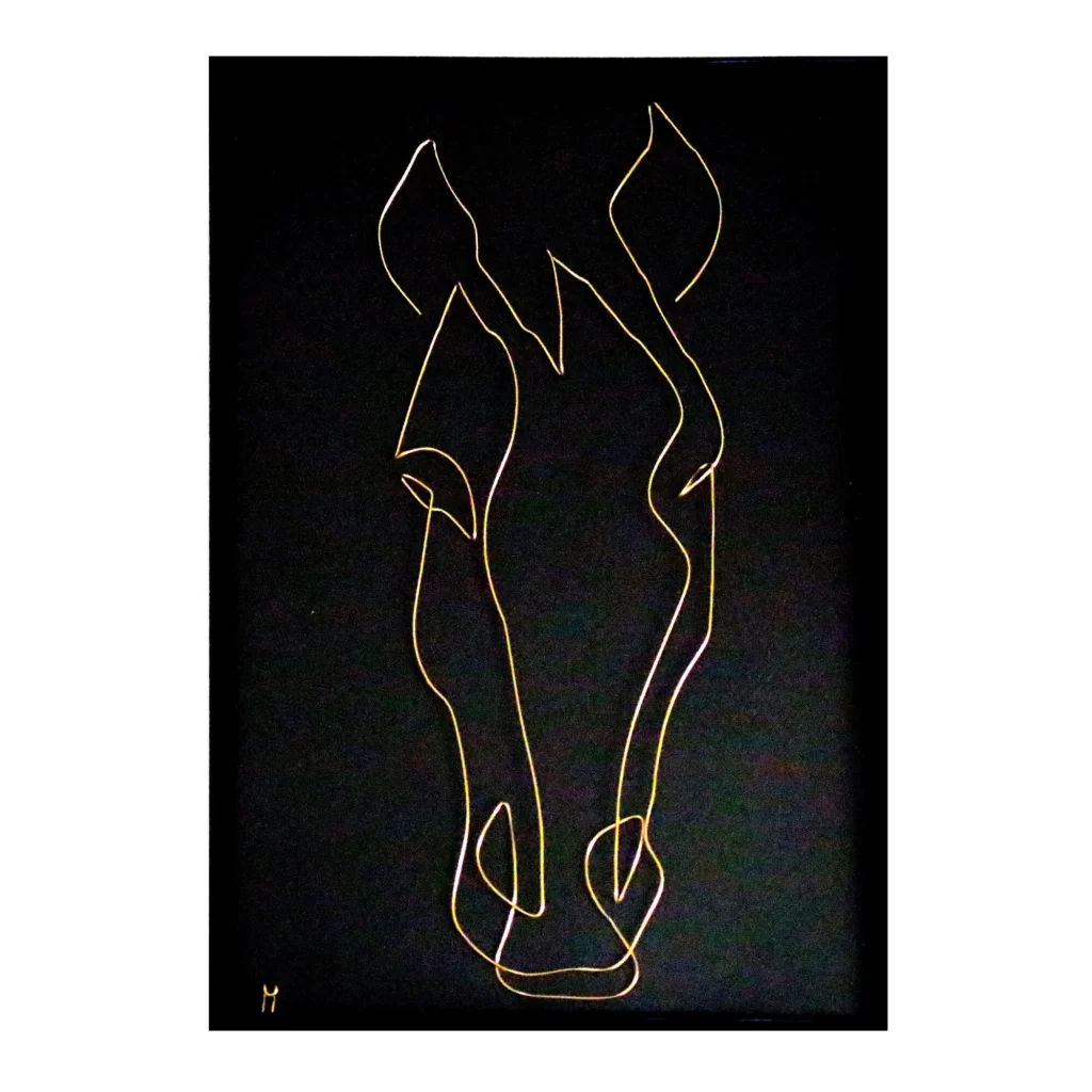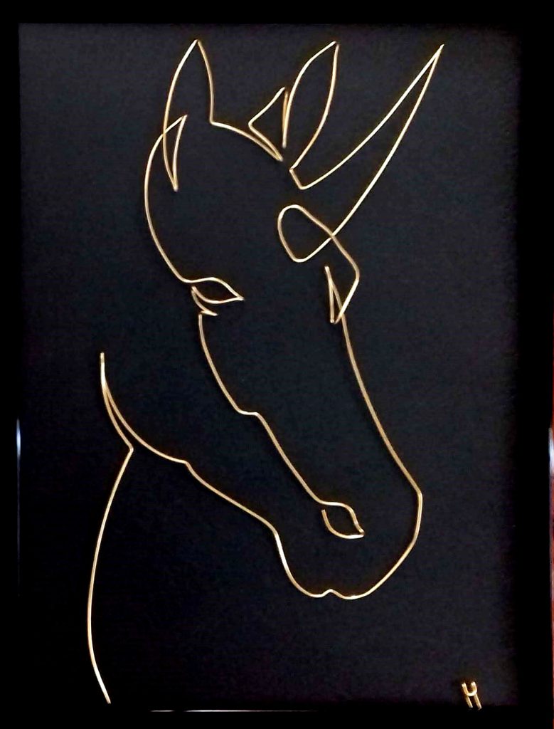 Cal Naravas – Tablou 30×40 cm sculptura in fir continuu de sarma auriu de 1 mm, rama neagra 30×40 cm
