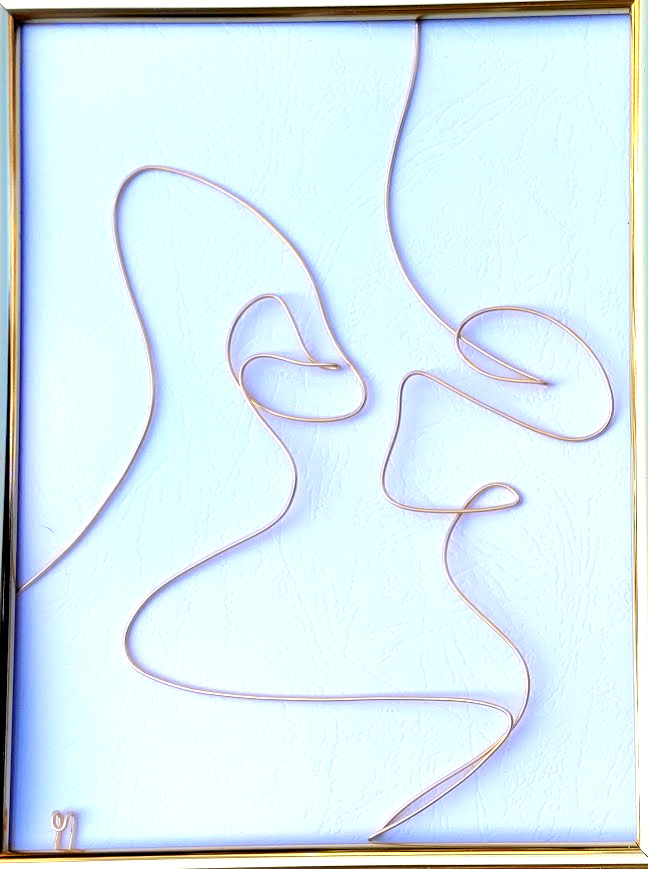 Liniile subțiri ale sârmei se împletesc cu o eleganță neașteptată pentru a forma două siluete umane care se apropie una de cealaltă într-un sărut pasional. Detaliile sunt impresionante, având în vedere materialul simplu din care este realizată această operă.